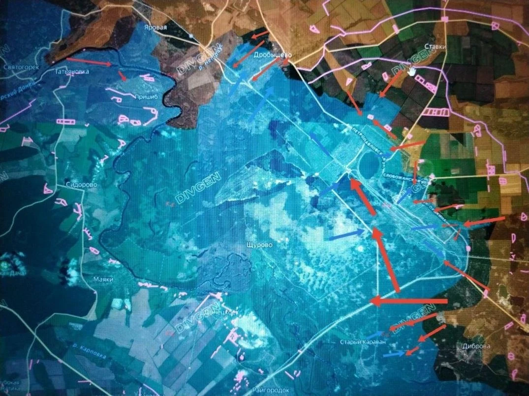 Южнее, со стороны Дибровы, продолжается рывок к Старому Каравану и Брусовке с целью перерезания трассы на Славянск. В Дробышево идет зачистка центра, а враг оттеснен за железную дорогу.