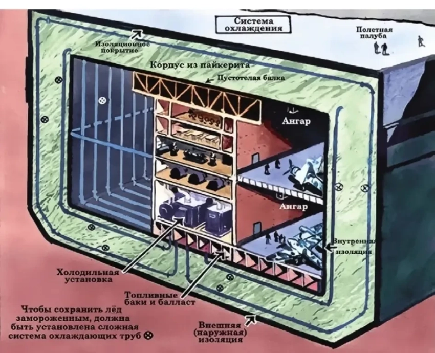 Рассматривался также вариант «сборки» авианосца в одной из защищенных от волн, течений и постороннего взгляда бухт на севере Канады из плит натурального льда. Однако высокая хрупкость льда грозила тем, что данное чудо техники развалится в Атлантике от ударов волн. Кроме того, такой авианосец должен быть настолько большим, что по длине превышал, по крайней мере, две атлантические волны (во время шторма их бывает примерно 5–6 на милю). В этом случае, как показывали результаты расчётов, он сломается, как балка при изгибе.