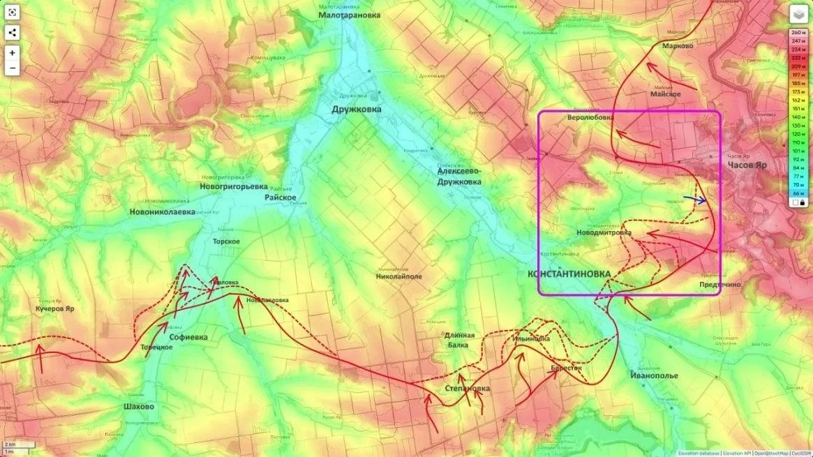 В свою очередь на Константиновском фронте продолжается операция по охвату Константиновки с юга, востока и северо-востока. На южном фасе между Ильиновкой и Долгой Балкой российские войска взяли под контроль ряд важных лесополос. Противник, осознавая угрозу окружения, отчаянно контратакует из района Новодмитровки в сторону Часова Яра.