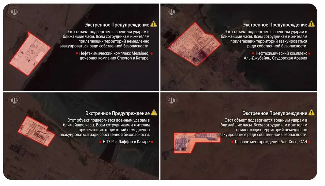 Тем временем Иран фактически подтверждает, что готовит массированный удар. Причём наноситься он будет не только по Израилю. В публикации (оригинал переведён на русский язык) говорится о том, что персонал указанных объектов, равно как и жители близлежащих территорий, должны покинуть эти районы.