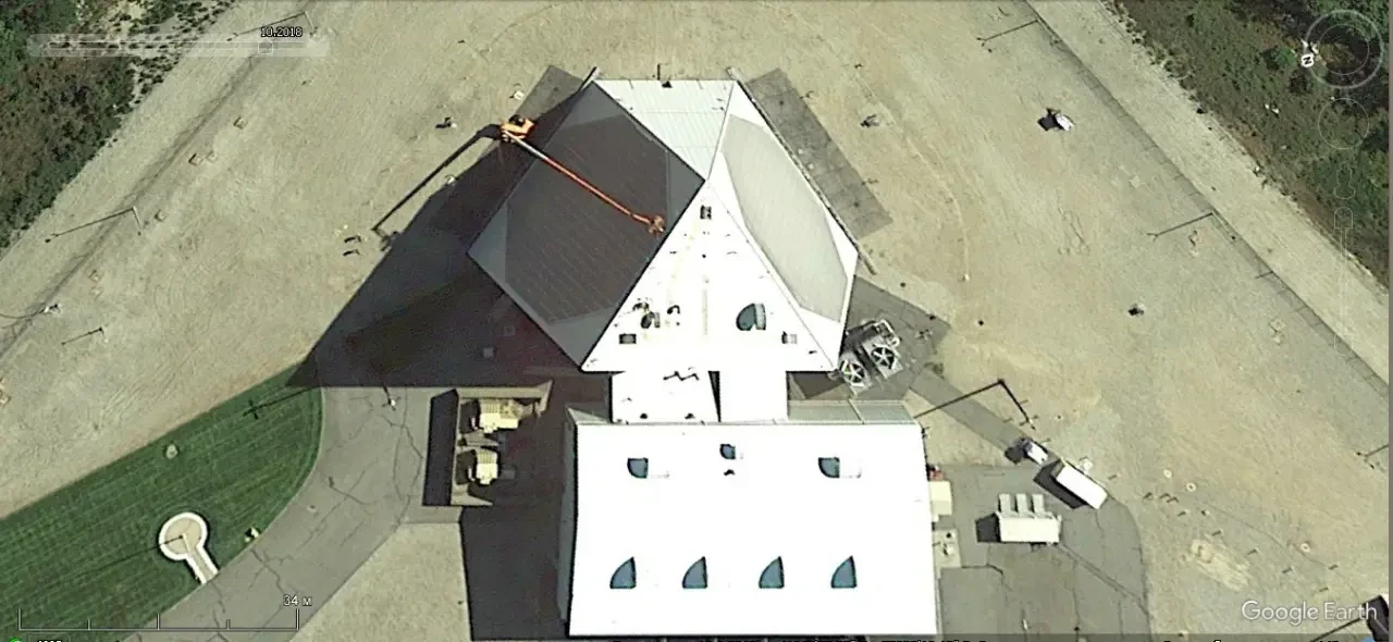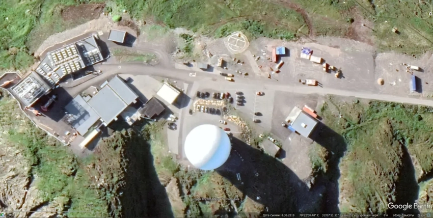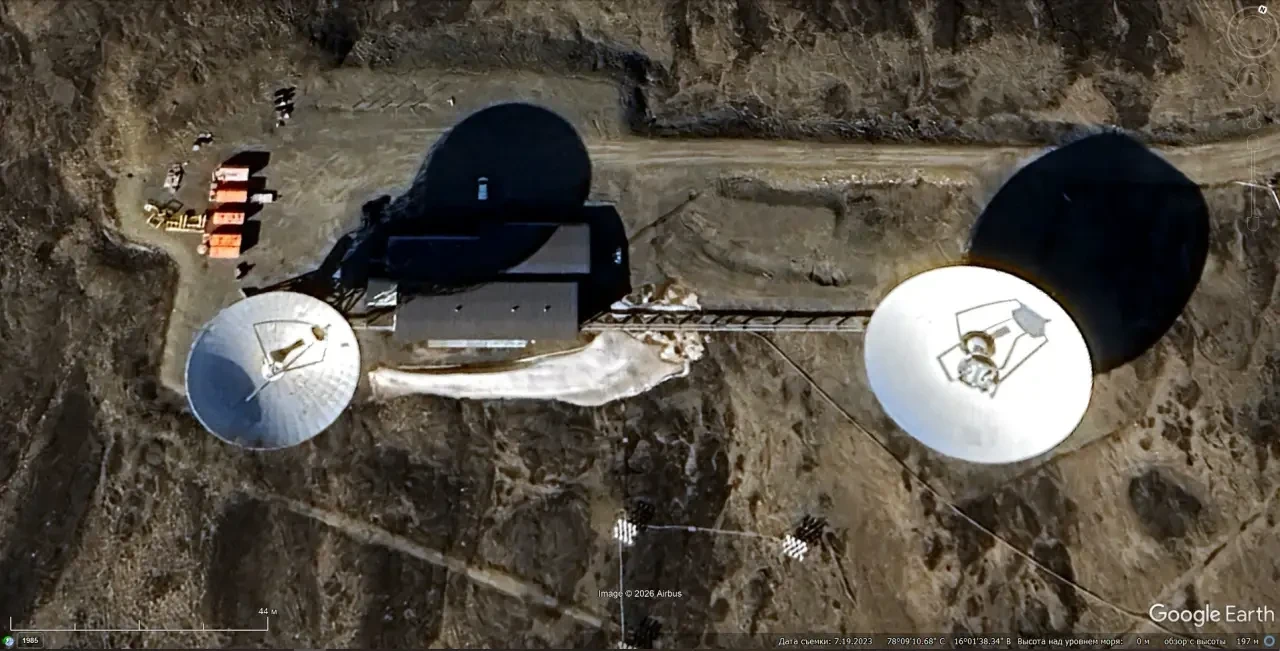 Спутниковый снимок Gооglе Еаrth: элементы радарного комплекс EISCAT на Шпицбергене. Снимок сделан в июле 2023 года