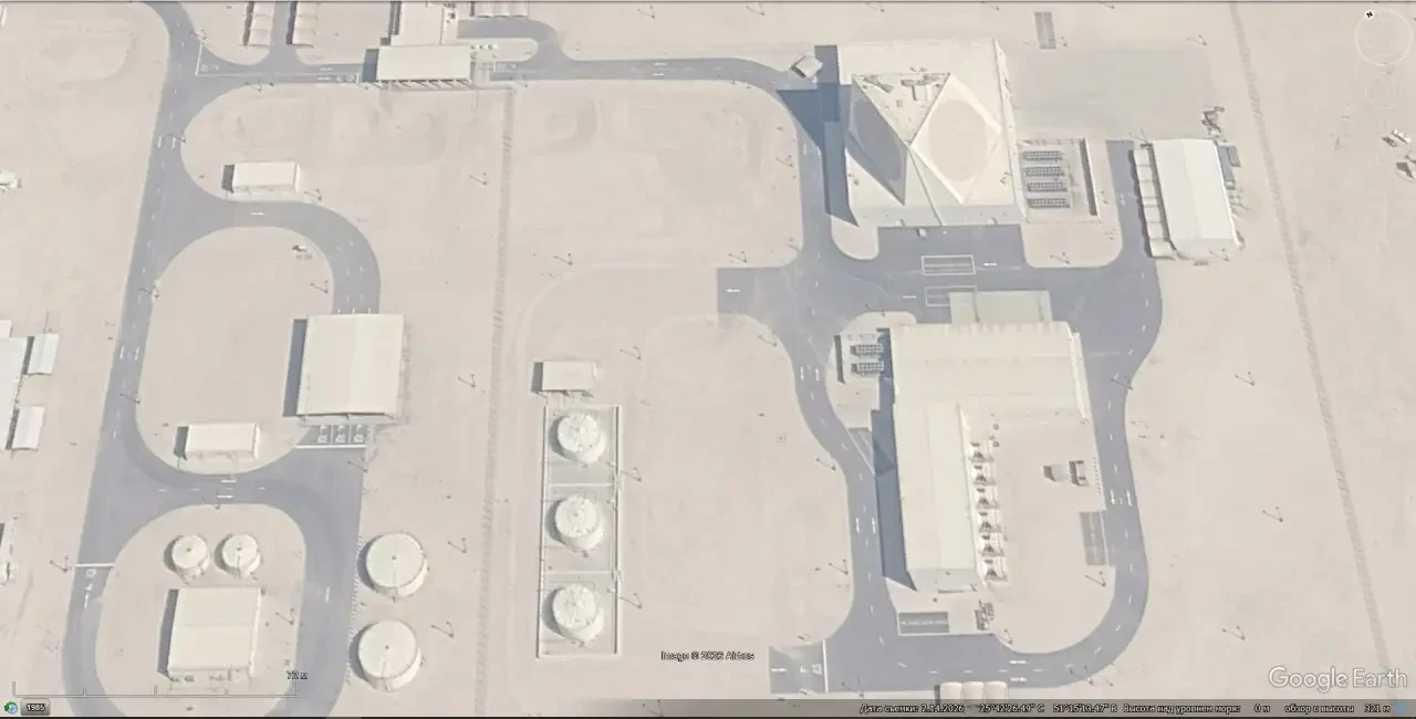Спутниковый снимок Gооglе Еаrth: РЛС AN/FPS-132 в 1 км южней авиабазы Равдат-Хатан в Катаре. Снимок сделан 14 февраля 2026 года