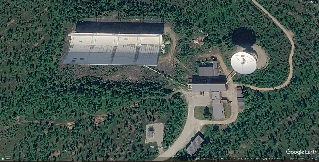 Спутниковый снимок Gооglе Еаrth: РЛС AN/FPS-129 Have Stare на южной окраине норвежского города Вардё. Снимок сделан в августе 2019 года