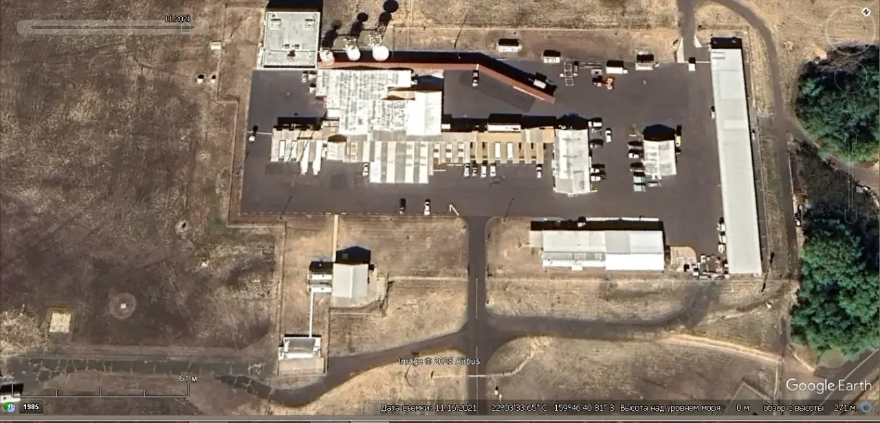 Спутниковый снимок Google Earth: радиолокационный пост с РЛС AN/TPY-2 на западном побережье острова Кауаи. Снимок сделан в ноябре 2021 года