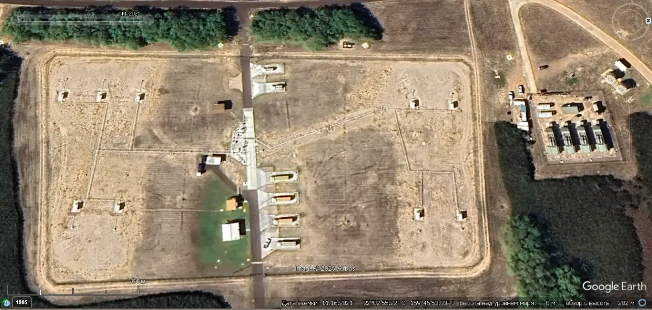 Спутниковый снимок Google Earth: самоходные пусковые установки системы THAAD на западном побережье острова Кауаи. Снимок сделан в ноябре 2021 года
