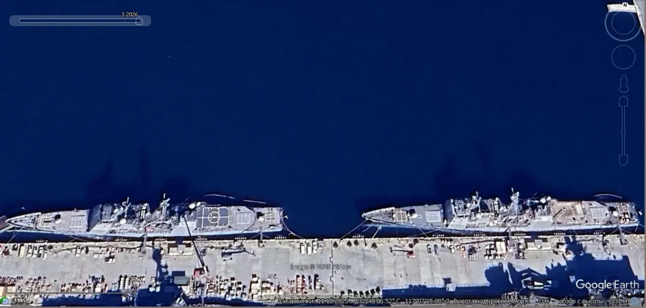 Спутниковый снимок Google Earth: крейсеры типа «Тикондерога» у пирса военно-морской базы Сан-Диего. Снимок сделан в ноябре 2025 года