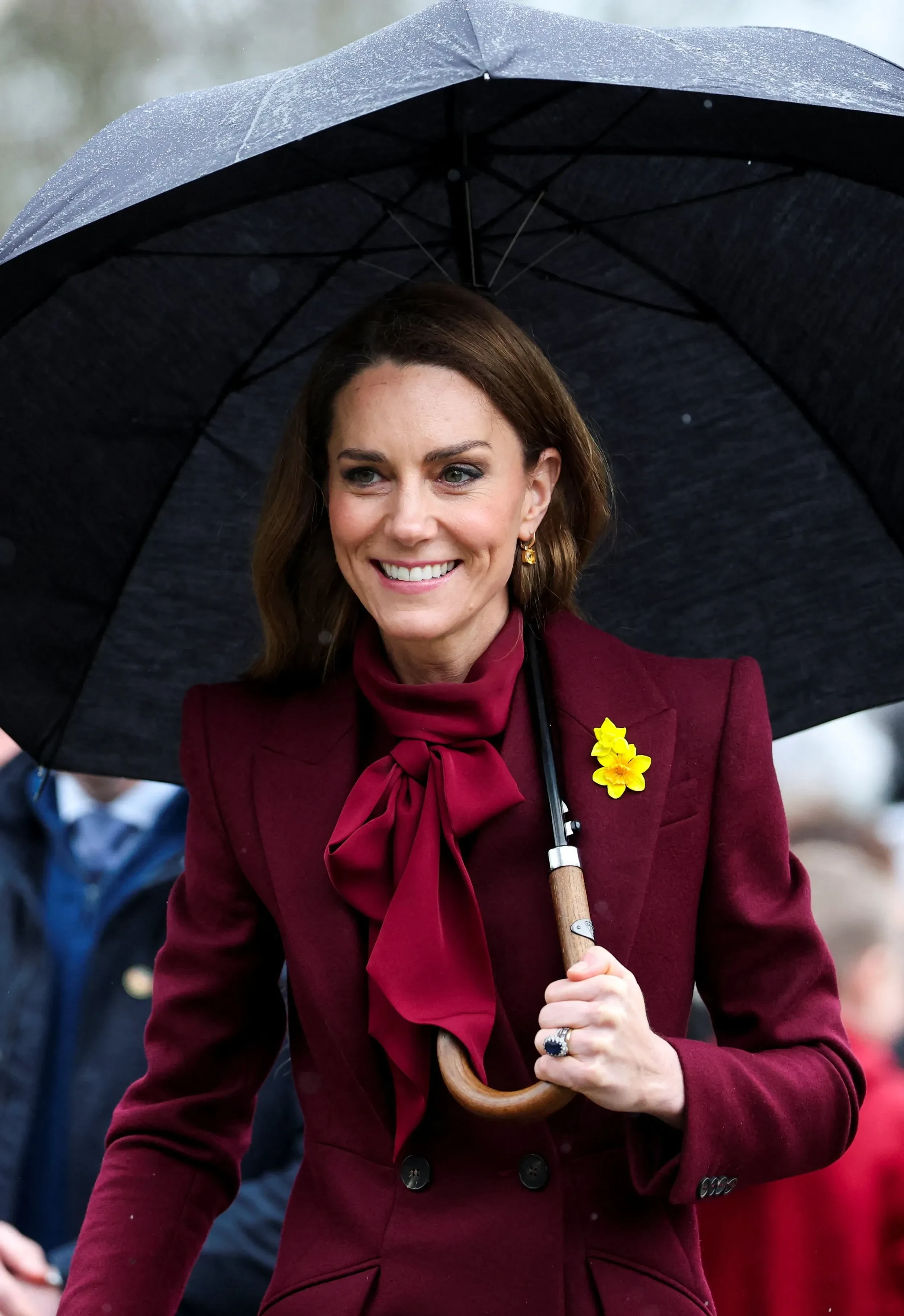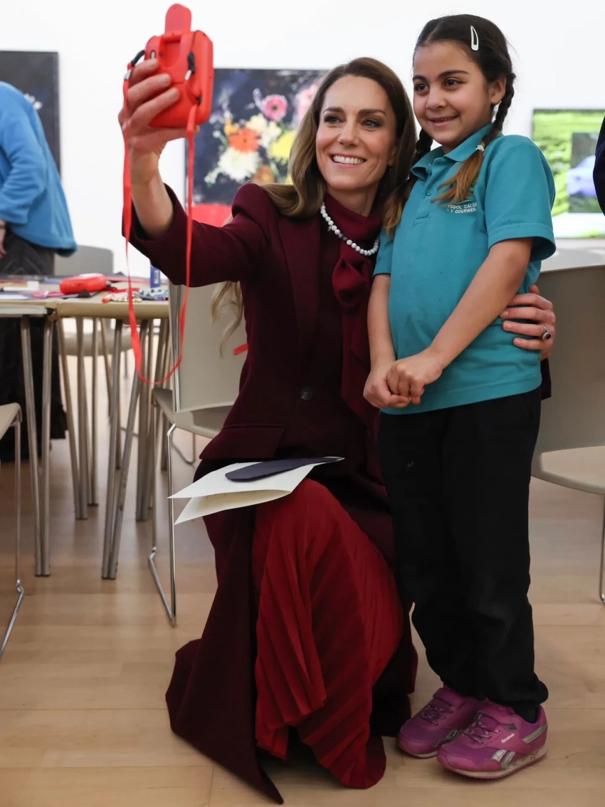 Для визита 44-летняя Кейт выбрала образ в бордовых оттенках: она была в любимом красном пальто от Alexander McQueen, которое уже не раз носила на публике, блузе с бантом, макси-юбке и высоких лакированных сапогах. 43-летний Уильям предпочёл коричневый пиджак, синий джемпер и брюки прямого кроя. На груди у пары красовались одинаковые броши в виде нарциссов — символа святого Давида, который традиционно носят в день праздника как знак уважения к валлийскому наследию.