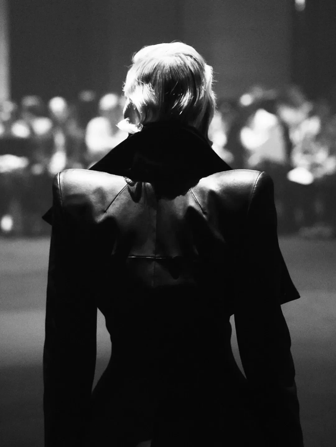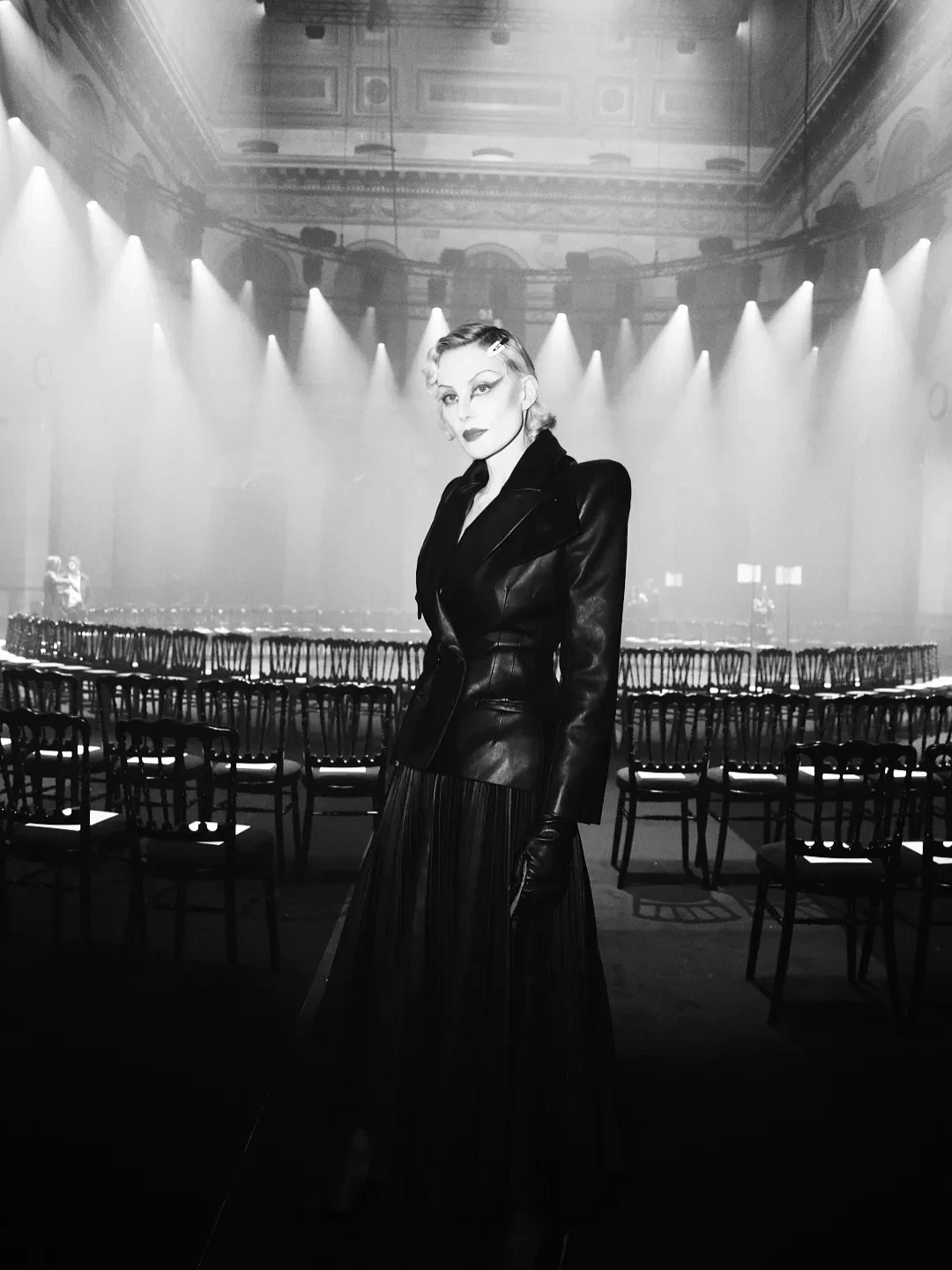 Рената дефилировала в чёрном кожаном жакете с объёмными плечами и плиссированной длинной юбке. Образ дополняли сапоги и перчатки, а финальным штрихом стал макияж в готическом стиле с длинными стрелками и алыми губами.