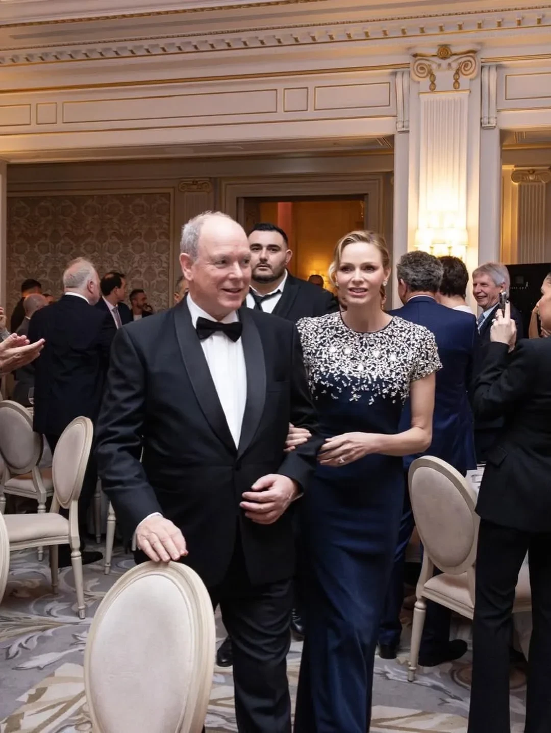 48-летняя княгиня появилась на мероприятии в синем платье в пол с серебристой вышивкой, а 68-летний князь Альбер надел классический чёрный смокинг. Гала-вечер организован национальным профсоюзом профессиональных игроков в регби в поддержку спортсменов, столкнувшихся с жизненными трудностями: травмами, финансовыми проблемами или необходимостью смены профессии после завершения карьеры.