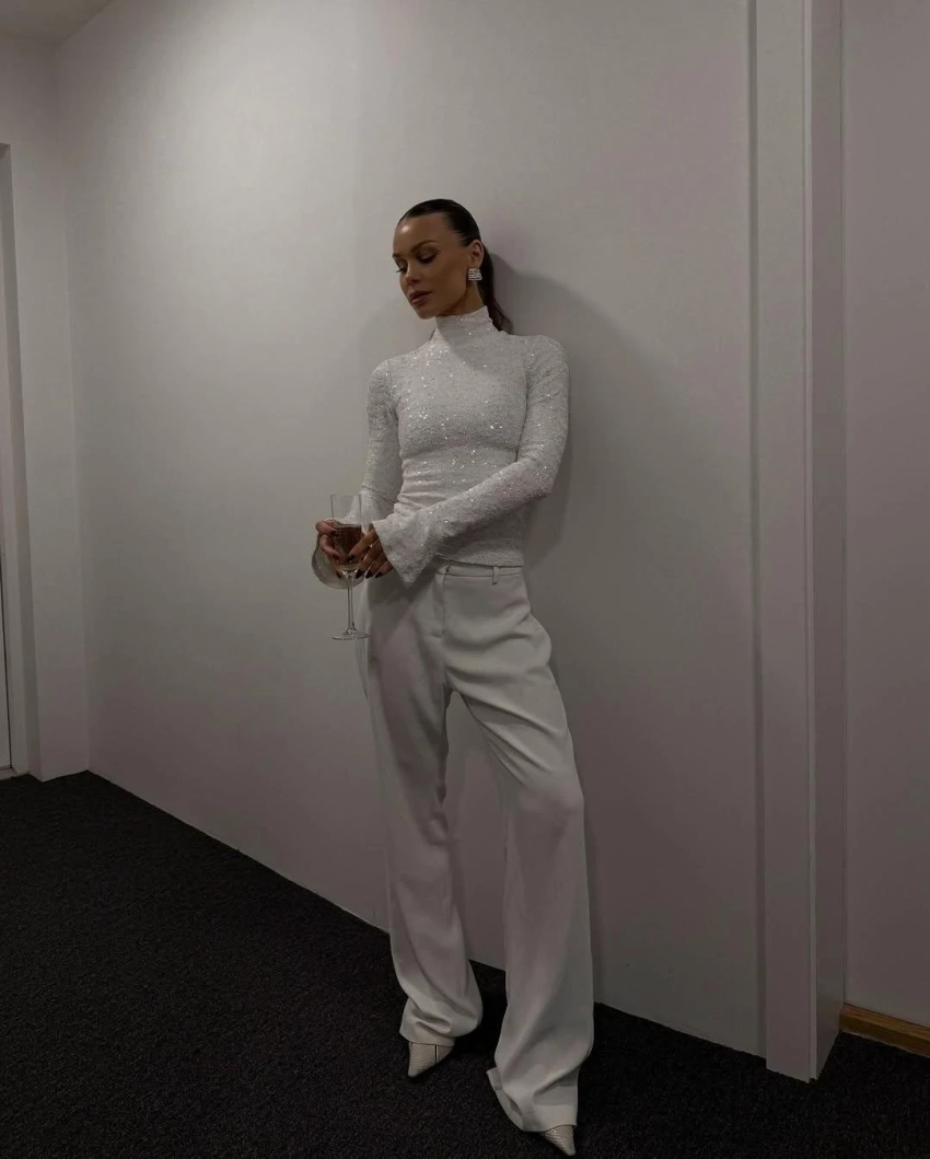 Белые брюки + сверкающий топ